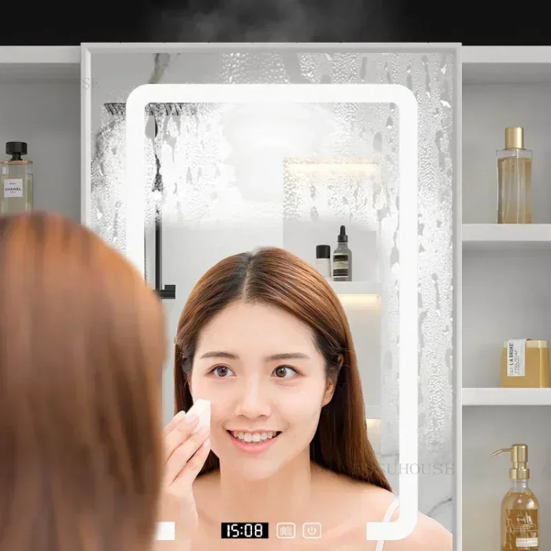 خزائن مرايا حمام ذكية من سبائك الألومنيوم الإيطالية، أثاث منزلي فاخر، خزانة حائط مع مرآة مكياج مع رف تخزين