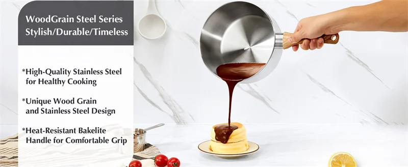 مقبض باكليت بارد الملمس لراحة لا مثيل لها: اطبخ بثقة! يوفر مقبض الباكليت المريح والمقاوم للحرارة قبضةً آمنة ومريحة، بينما يضفي تصميمه العصري والأنيق لمسةً من الأناقة على أي مطبخ.